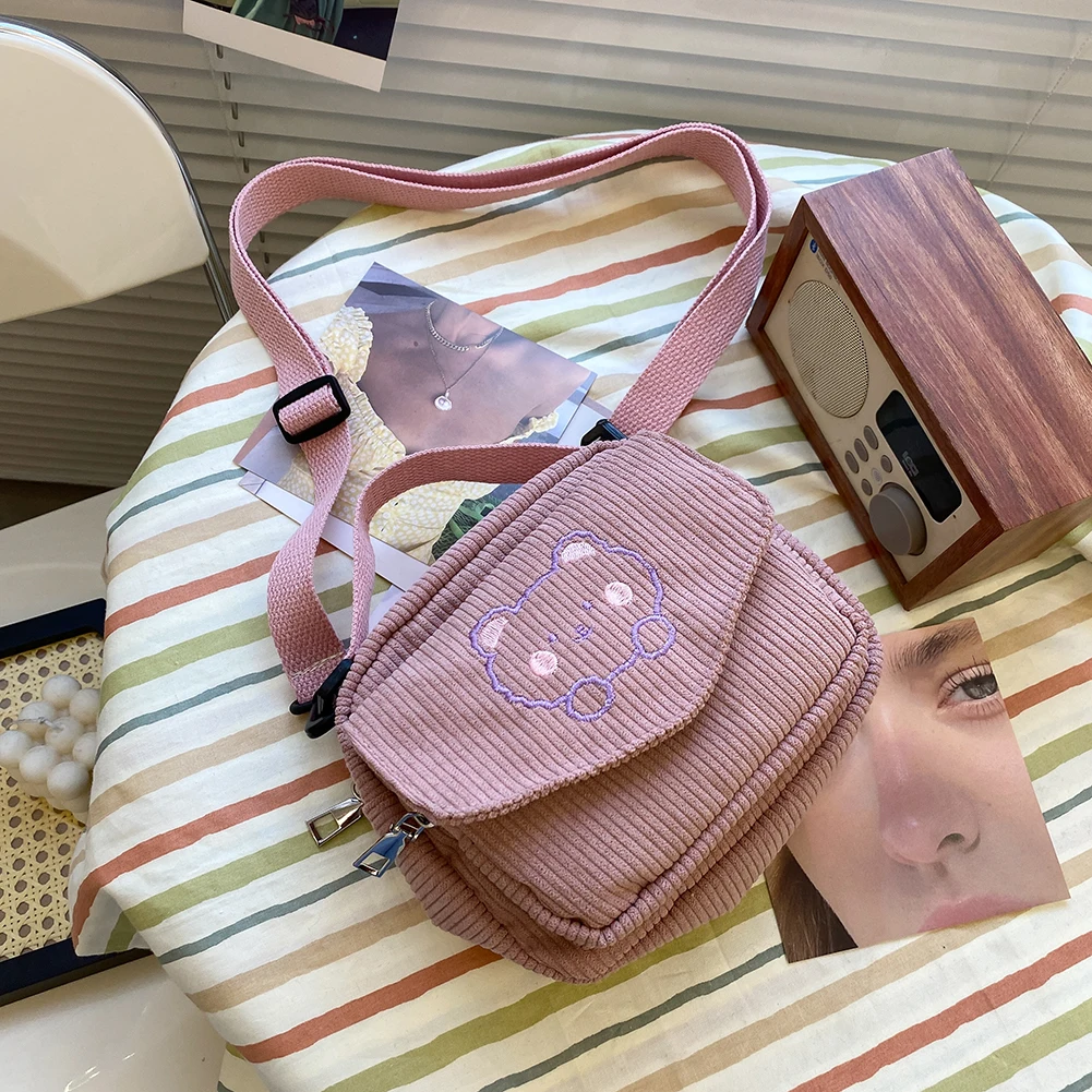 Corduroy Crossbody Bag Vintage Cute Shoulder Handbag Embroidery Bear Japanese Flap Pocket Autumn Winter Purse for Student Girls